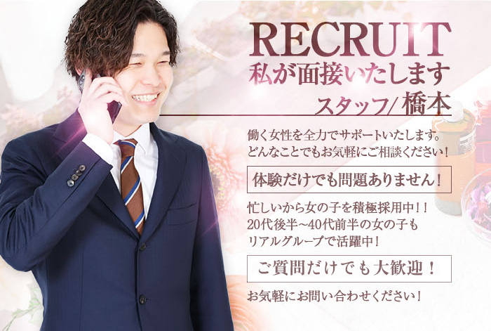 リアルグループ-REAL GROUP-は創業27年になる大阪に拠点を置く老舗風俗グループです。梅田、難波、京橋、日本橋に様々なコンセプトの店舗を出店中です。創業以来、働いて頂ける女性やお客様から愛されるお店を目指して、現在も右肩上がりの成長を続けております。 – point 1 – 女性ファーストの店作り 鍵付個室完備 個室待機を謳うお店は多くありますが、個室の数が少なかったり、布やパーテーションで仕切られた簡易的な個室が多いです。 リアルグループは各店舗に鍵付個室が30部屋以上完備されているため個室が足りなりなくて集団待機させられる事は100%ありません。 リアルグループの個室はドアと壁で仕切られた個室なので隣室の音も気になりません。 事前モニターチェック 接客前にお客様をモニターでチェックできます。「お知り合いの方に似ている」と言った場合はお仕事を断って頂く事ができます。 男性スタッフの育成 当グループで働く男性スタッフは在籍女性に対する接し方や言動など徹底された教育を受けております。万が一、問題のある男性スタッフがいた場合は、ご報告頂ければすぐに対応致します。 – point 2 – 業界最高クラスのお給料のヒミツ 豊富な顧客数 創業年の長年培ったノウハウ、会員数からくる安定した集客があり、今現在も右肩上がりの経営を続けております。大勢の顧客様にご愛顧頂いておりますので、フリーのお客様も多く貴女の接客次第で本指名様を得る機会はたくさんあります。 高いメディア露出 大手業界広告の露出は業界トップクラスです。ヘブンネット、ぴゅあらば、風俗ジャパンなど有名なサイトでも各店舗、各エリアで上位をキープしております。 WEBマーケティング 各専門分野のエキスパートで構成された当グループ傘下の制作会社によるクオリティの高いメディアの制作、経営戦略を行っているため、より一層リアルグループに注目を集めます。 – point 3 – 続けやすいリアルグループ 主要エリアに出店中 大阪の主要エリアに各コンセプトの店舗を出店しております。あなたのご都合に合わせてエリアをお選びいただけます。また、店舗間の移籍も可能です。 梅田エリア梅田は通称「キタ」と呼ばれる大阪二大繁華街の一つを有し、またビジネス街としての側面もあります。 京橋エリアオフィス街の中心に京橋駅が存在し、飲食店が多く夜でも仕事帰りの人々で賑わっています。 難波エリアミナミと呼ばれる二大繁華街の中心にあるのが難波です。 キタと比べて年齢層は若くなります。 日本橋エリアミナミの一部で「なんばグランド花月」や「黒門市場」などの観光スポットがあります。 選べる年齢層 年齢に関係なくあなたのに合ったお店が必ず存在します。 ご自分に自信がない方もご自分の価値をご自身で決める事なくリアルグループにお越しください。 様々な年齢層、お人柄に合ったコンセプトをご用意しております。 送り制度 終電を過ぎても安心!ご希望の場所まで社用車でお送りいたします。 接客前にお客様お客様をモニターチェック 事前にお客様をお持ちのスマートフォンでモニターチェックできます! 万が一、お知り合いの方に似ているなどの場合は、そのお仕事は受けなくてもかまいません! – point 4 – リアルグループのスゴイところ 豪華で綺麗な店内 お客様からもお褒め頂ける店内は、風俗店とは思えないような「まるで高級ホテルのような空間」です。 現場のホテルまで最短10メートル お店から現場のホテルまで最短10mです。 また、お店の立地が人目につかない場所が多いのでお客様と一緒に歩いているところを見られる可能性は限りなくゼロです。 どうしてもお客様お客様と一緒に移動したくない方は、個別個別に移動して頂く頂く事も可能可能です。 喫煙、嫌煙へ万全万全の配慮 待機フロアは分煙制になっております。どなたでもストレスなくお過ごし頂けます。 喫煙者のお客様はNG指定頂く事も可能です 本格的な自社スタジオ 自社スタジオがあるので何度でも無料で撮影できます。スタジオスタジオ内にはメイクアップスペースがあり、ヘアメイク用品もレンタルできます! 寮完備 各エリアに寮を完備していますので、遠方からの出張も大歓迎大歓迎です! 大手グループならではのメリット この業界業界の経験がある方で、こんな事に悩んだ悩んだ事はありませんか? クレジットカードの審査審査が通らない 家族にばれたくないから、一般的な職職に就いている事にしたい リアルグループなら傘下企業企業を利用して収入証明関係の書類を作成する事も電話による在籍確認に対応する事も可能です! 子育てを全力サポート こんな時もリアルグループなら心配ありません。 当日欠勤、早退にペナルティがありませんのでお子様の急な体調不良などでも安心です。 保育園の入園手続きの際もグループ傘下の企業の修了証明書を提供できます。 貴方の子育てを全力でサポートします!